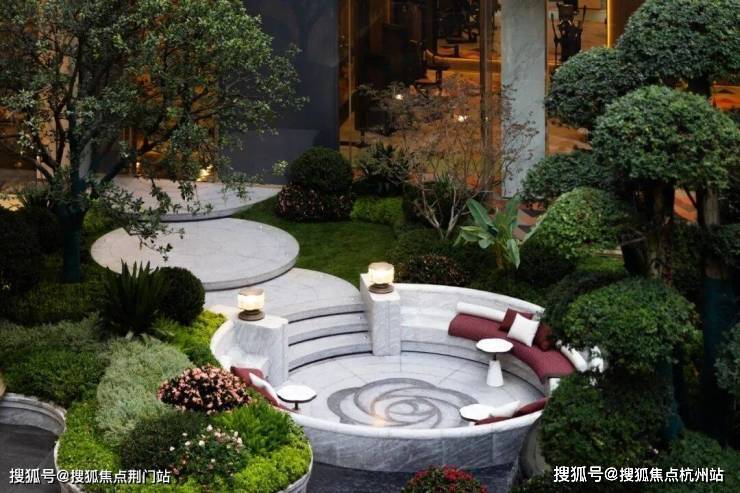 吧台另一边的下沉式庭院,一眼看上去特别浓烈,因为树都选得很浓密很贵重,而且还给每一棵大树都做了「专属花盆」,让整个庭院瞬间变成了一个精致的巨型盆景花园。