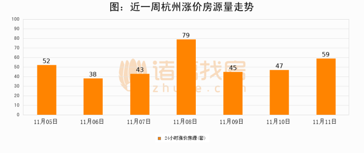 根据诸葛找房数据显示,杭州24小时涨价房源量为59套,较11月10日增加12套,环比上涨25.5%。与此同时,涨价房源占比小幅扩大,业主信心有所提升。