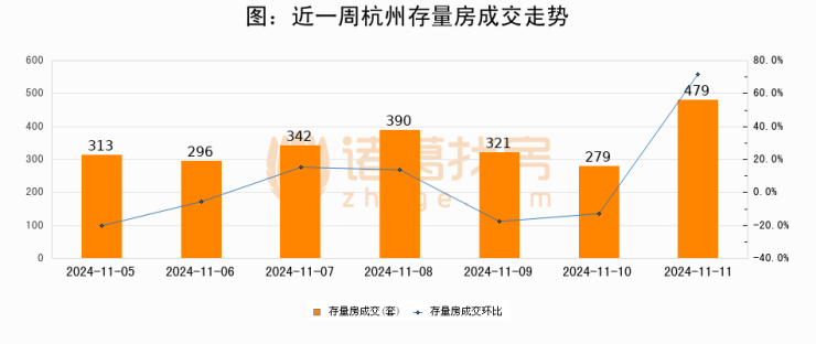 从存量房来看,2024年11月11日杭州存量房单日成交479套,比昨日增加200套,环比上涨71.7%。从近一周存量房成交来看,杭州存量房日均成交套数为345套,11月11日单日成交479套,高于近一周平均水平38.8%。