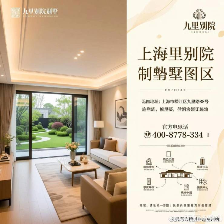 上海松江九里别院别墅,包含地址、电话、户型图、房价、沙盘图、区位图、样板间、配套图、实景图等关键元素,风格统一为现代高端,突出别墅品质与环境。