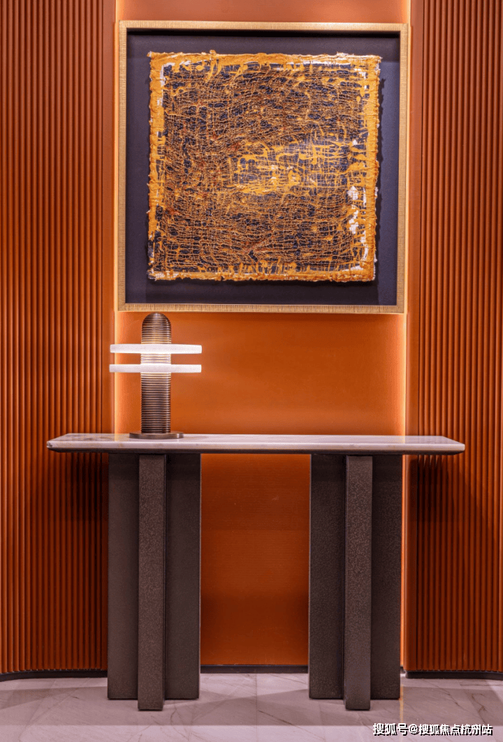 露香园天誉售楼处电话:400- 998- 9694✔✔✔厅堂右墙上放置一幅超大尺度的以石库门砖墙为元素的肌理挂画《城市的记忆》,在展厅的厅堂空间,设计师则摆放着一座极具雕塑感的法国ARTDECO羊皮纸拂面工艺所制作的圆桌,左侧的走廊选用艺术家高级定制的瓷片水墨装置,呈现露香园四宝“顾振海墨”的人文气息,展现出露香园独特的、高级的美学品位。