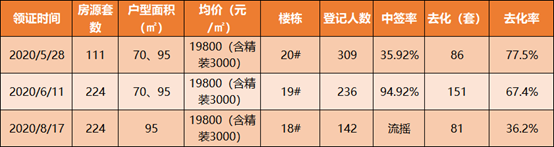 项目已经开盘3次,都是按照限价精装均价19800元/㎡出售。但3次的开盘登记,中签率节节攀升,最近一次8月开盘登记甚至流摇。