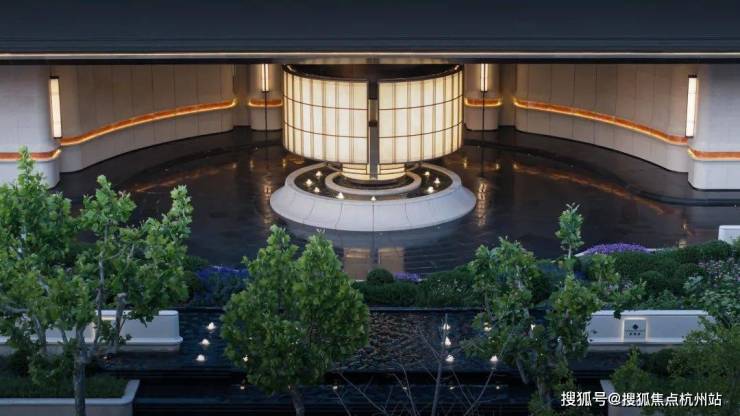 双轴线的设计,充分 拓宽了视野面与观赏点位,环形回廊、精神游廊与下沉庭院通过立体景观平台相融,又创造出隔岸听泉的诗意场景。