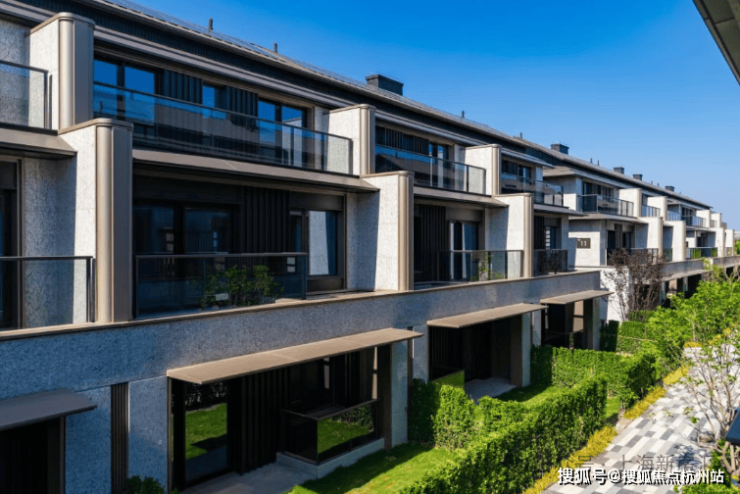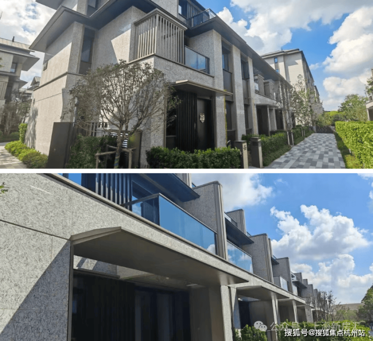 联排建筑立面上进口金钻麻石-全石材铺装搭配咖色的铝板装饰线条,不同凡响的精奢感和厚重的质感,卓尔不群,放眼整个松江,难觅雷同。