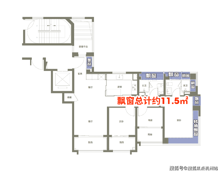 三阳台合计面积约15㎡ ,拓展后两个次卧尺度更舒适,做到三间真正好用的卧室;部分户型连接 设备平台 ,可作晾晒、收纳、园艺等多功能空间;全屋应飘尽飘, 主卧配备270°超大转角飘窗+主卫多角度飘窗 , 飘窗赠送约11.5㎡ 。