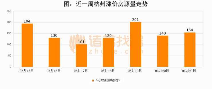 根据诸葛找房数据显示,杭州24小时涨价房源量为154套,较03月20日增加14套,环比上涨10%。与此同时,涨价房源占比小幅扩大,业主信心有所提升。