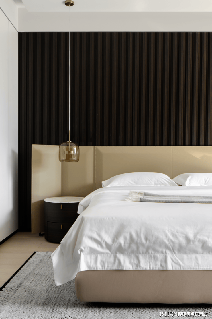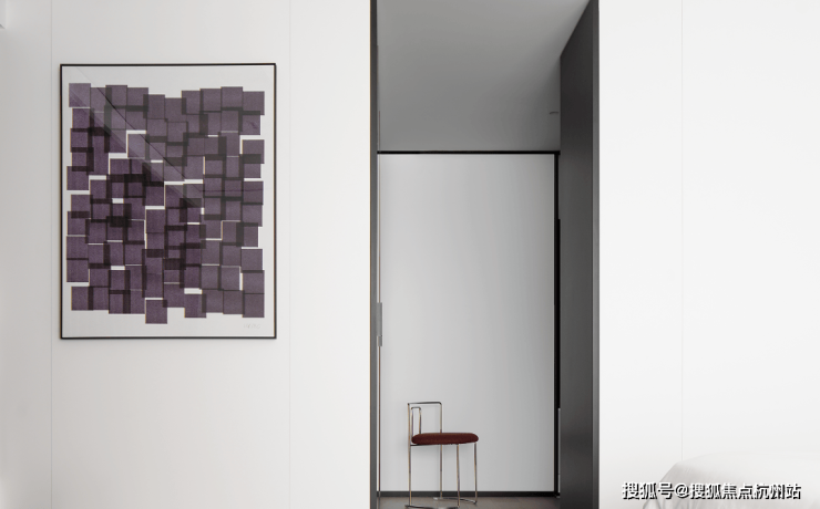 私密场域依旧保持静谧,黑白色基础上搭配了更多的色彩,例如深棕、浅紫等,艺术品的衬托深邃迷人,热络了家的氛围。