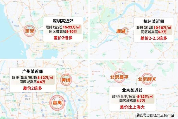比如,上海近郊联排单价普遍在7-9万/㎡,总价900-1500万;而周边高层/洋房约4.5-5.5万/㎡,联排与高层比值仅为 1.6-1.7倍。