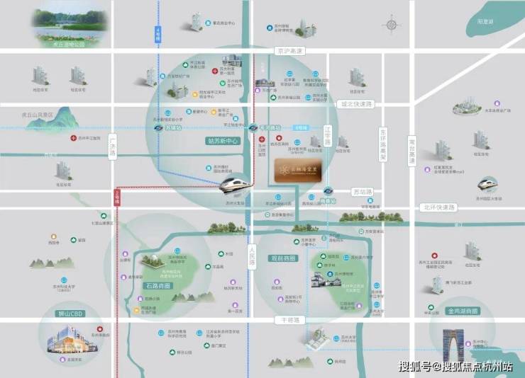 •立体交通:轨交2/4/6号线、北环快速路、苏州火车站、京沪高速、常台高速等