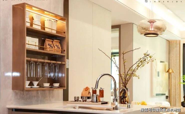 半开放式厨房,打破了传统的全封闭设计,与餐厅无界相通,面朝客厅与阳台,形成S型流畅生活动线,也打破了居家生活的空间隔阂,无形之间,增强家人之间在日常时刻的交流与互动。
