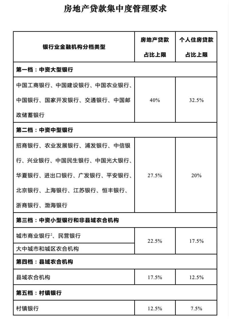2020年最后一天,中国人民银行、银保监会发布了《关于建立银行业金融机构房地产贷款集中度管理制度的通知》,建立了银行业金融机构房地产贷款集中度管理制度,对银行业金融机构分档制定房地产贷款和个人住房贷款占比上限标准,并在2021年排名前列天开始实施。严控银行房地产贷款和个人住房贷款在贷款业务中的占比。
