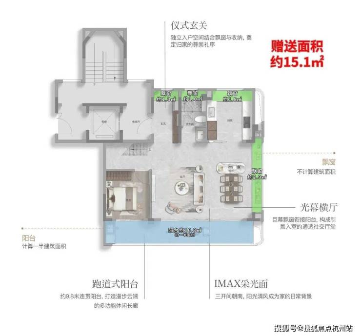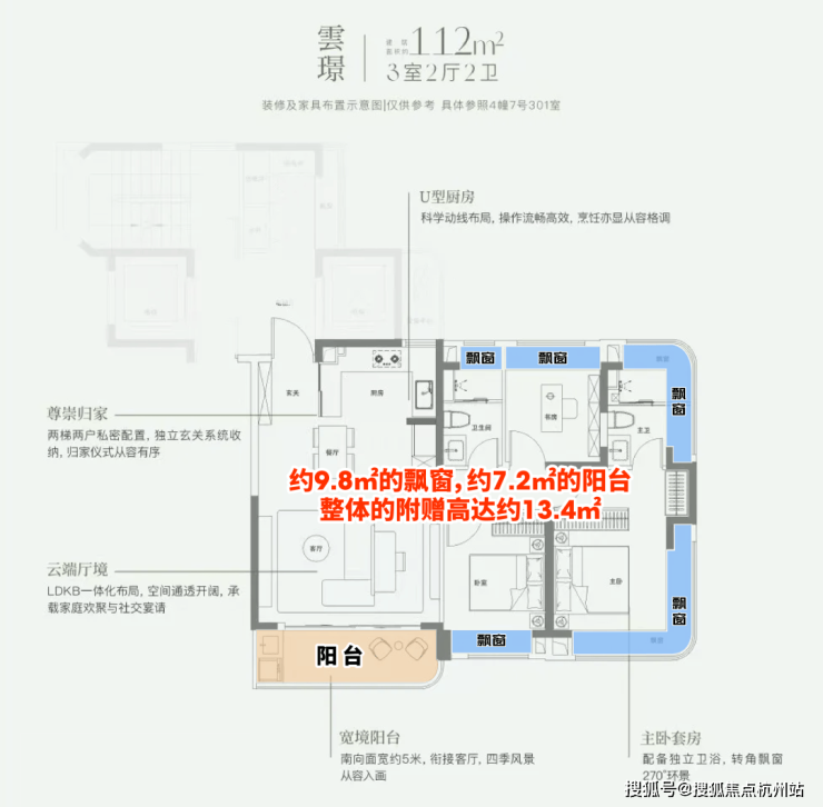 第一,这个户型有约9.8㎡的飘窗,约7.2㎡的阳台,整体的附赠高达约13.4㎡。 这是目前上海外环沿线,是附赠率最高的一个小高层产品。