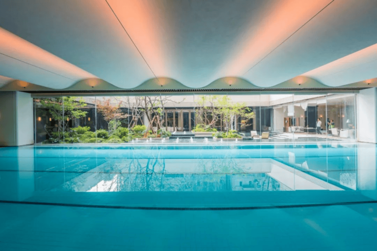 最后来看泳池。云邸玖章做了再升级。改为采用大尺度的落地玻璃拼接,约2.4米宽巨幅玻璃,且通过精致的玻璃交接细节处理增进室内外空间的融合,强调泳池的无界感,真正实现了无边泳池的效果、质的飞跃。