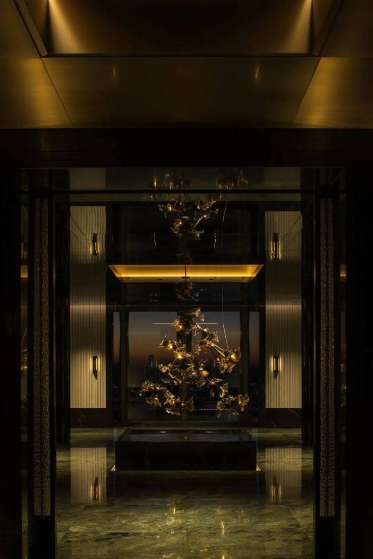 比如红酒雪茄厅,设计灵感来源于迪拜奢华酒店The Lana,颇有一种老上海风情;多功能区是一个270度水景环绕的区域,玻璃门可开可合,关上就是私密空间,打开就能亲近自然。
