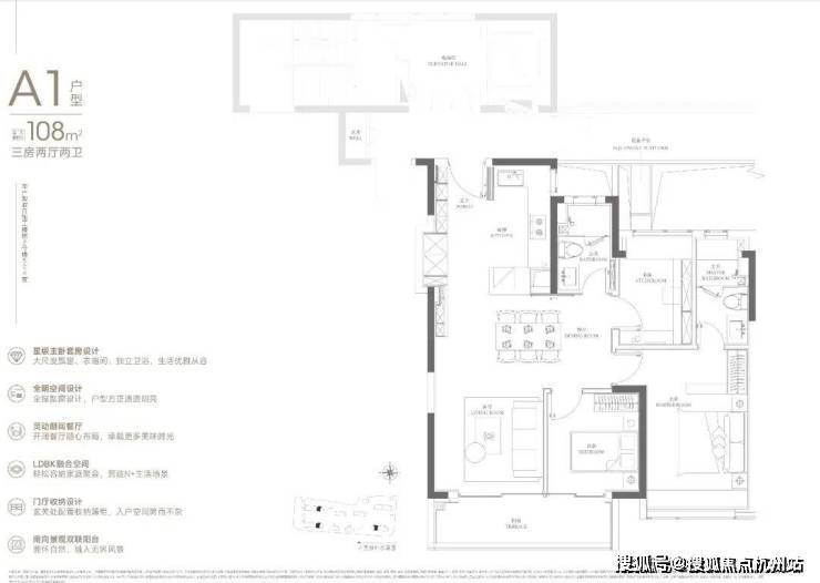 首先是进门即映入眼帘的LDBK一体化设计,搭配X灵动空间以及巨型宽面阳台,奢阔尺度非常出众;主卧约270°的转角飘窗,视野和采光全部拉满。