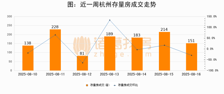 从存量房来看,2025年08月16日杭州存量房单日成交151套,比昨日减少63套,环比下降29.4%。从近一周存量房成交来看,杭州存量房日均成交套数为169套,08月16日单日成交151套,低于近一周平均水平10.7%。