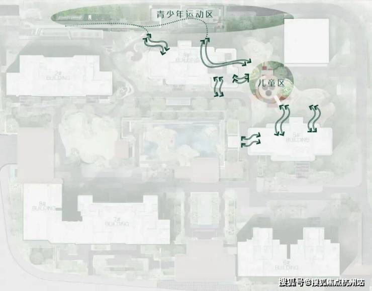 室内外无界渗透, 青少年运动场、宅间花园、儿童乐园与架空层的无界联动体系,打造无界交流共享空间 , 弱化交界面,室内外共享 , 形成园区功能互通;从儿童到青少年到成年人的全龄无界互通
