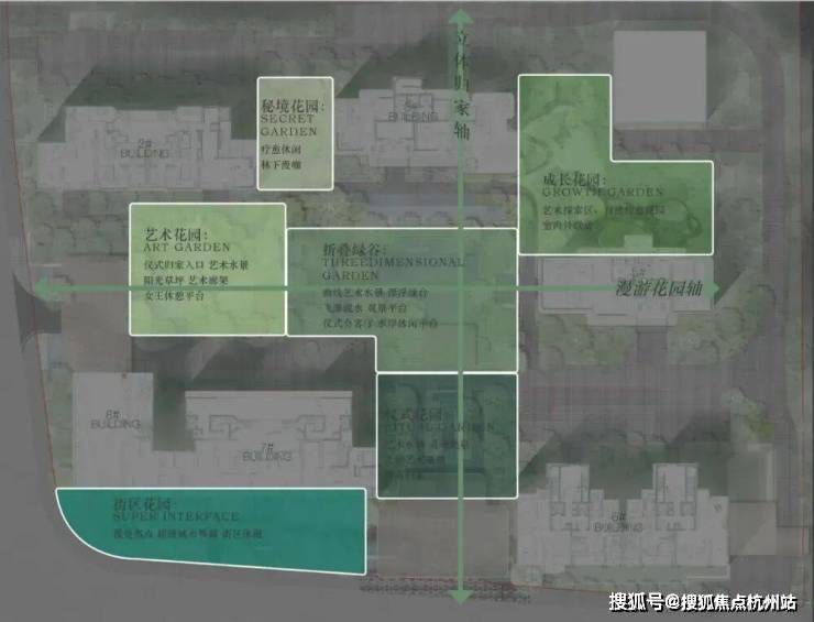 设计灵感源自 新加坡艾迪逊酒店与《天空之城》“漂浮的拉普达” ,以 “ 双轴五园” 为架构,打造约108米南北立体归家轴、约90米东西漫享花园轴,串联仪式花园、下沉庭院、儿童乐园、秘境花园、艺术花园五大花园