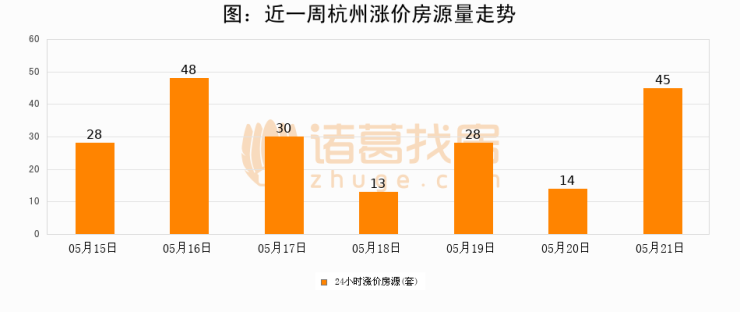 根据诸葛找房数据显示,杭州24小时涨价房源量为45套,较05月20日增加31套,环比上涨221.4%。与此同时,涨价房源占比小幅扩大,业主信心有所提升。
