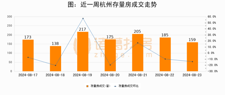 从存量房来看,2024年08月23日杭州存量房单日成交159套,比昨日减少26套,环比下降14.1%。从近一周存量房成交来看,杭州存量房日均成交套数为178套,08月23日单日成交159套,低于近一周平均水平10.7%。