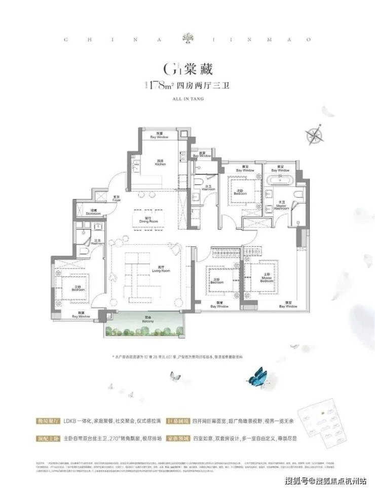建面约117㎡3房2厅2卫,做到了3+1开间朝南+5个飘窗+主卧套房设计+270°转角飘窗,所有的尺度都有进一步提升。