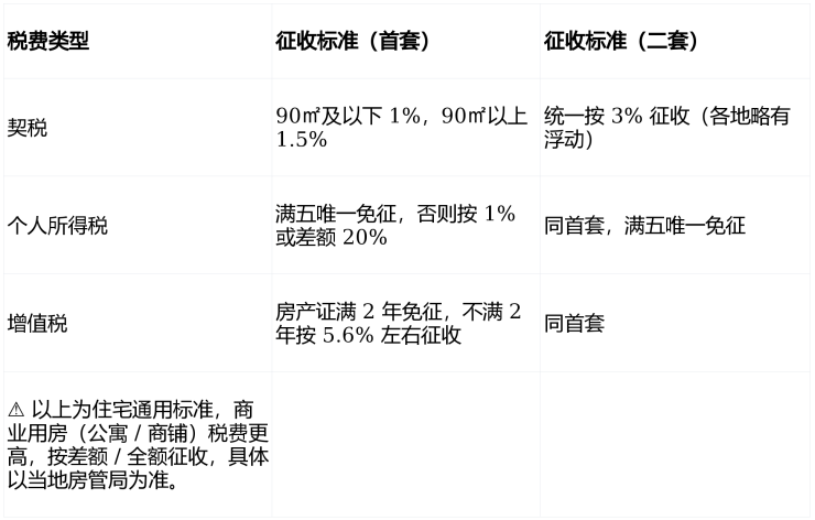 四、购房税费(住宅首套 / 二套核心税费)