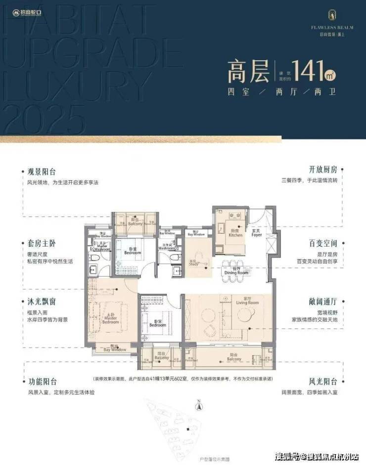 建筑面积约105㎡三房,进阶改善绝版“三阳台”户型,主力总价段约700万级,部分房源总价约650万级。