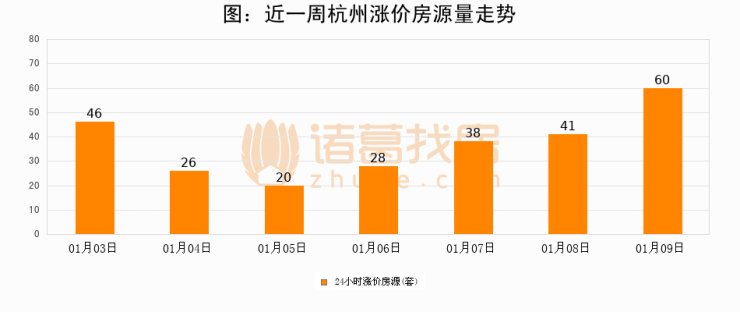 根据诸葛找房数据显示,杭州24小时涨价房源量为60套,较01月08日增加19套,环比上涨46.3%。与此同时,涨价房源占比小幅扩大,业主信心有所提升。