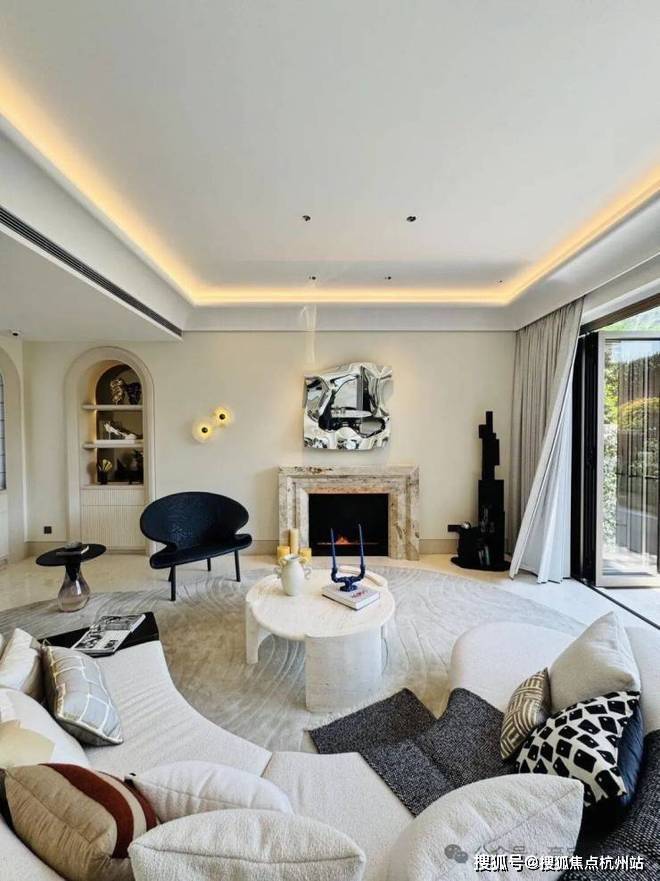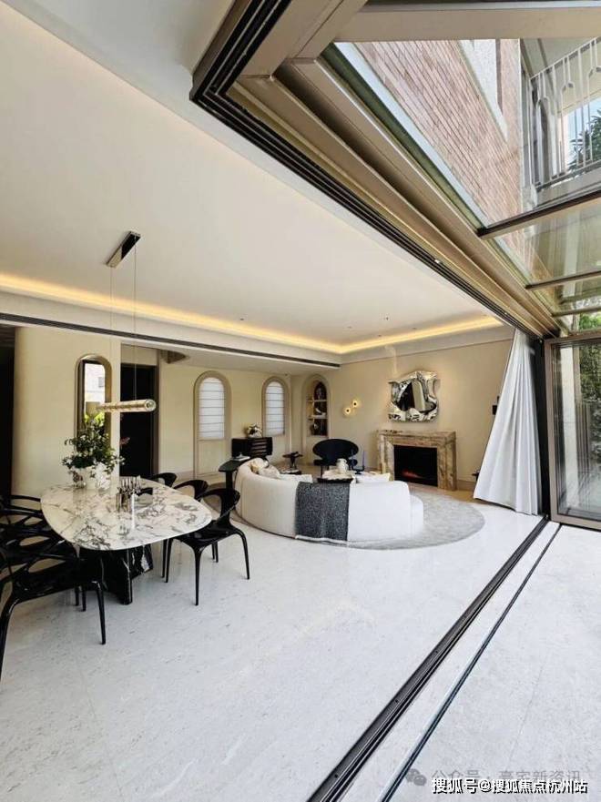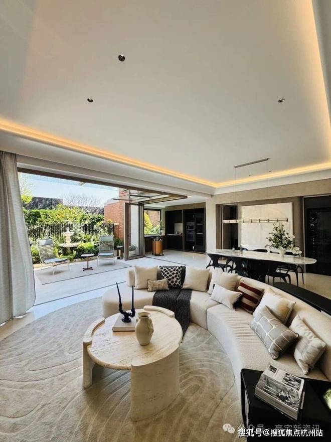 「无界空间」:客厅270度转角无柱设计,搭配落地玻璃,开阔视野将院中风景迎入日常.