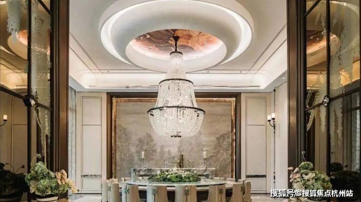 在景观落地窗环绕中,私宴厅以“花廊序列,美学对景”构筑专属的私谧空间,巨型水晶吊灯与浅色饰面的搭配,色彩质感上相得益彰,营造融合艺术、文化与生活美学的奢享感场域,成就令人神往的优雅社交范式。