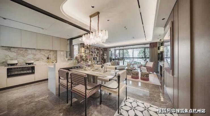 首先是奢石含量极高,从入户处的玲珑玉拼花与透光云石辉映,到翡翠绿奢石墙景、再到发光云石装饰点亮归家路,石材的典雅贯穿始终。