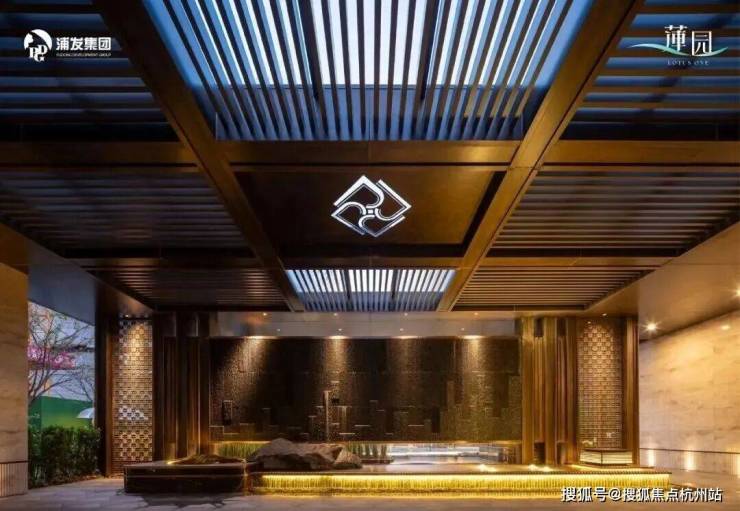 社区门庭由圣罗兰奢石、白雪公主透光玉石、玉曼米黄大理石,搭配深咖色定制纹样金属打造,气势磅礴!门庭内「水韵莲径」架空走廊以石材景墙与金属格栅构成曲径通幽的通道,极具东方韵味~
