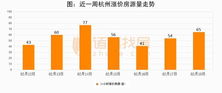 根据诸葛找房数据显示,杭州24小时涨价房源量为65套,较02月17日增加11套,环比上涨20.4%。与此同时,涨价房源占比小幅扩大,业主信心有所提升。