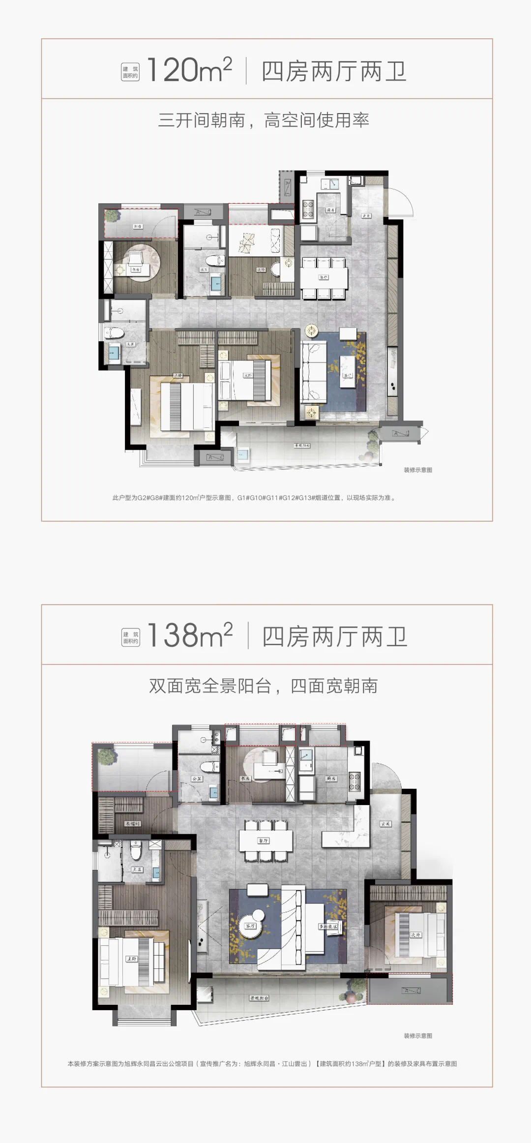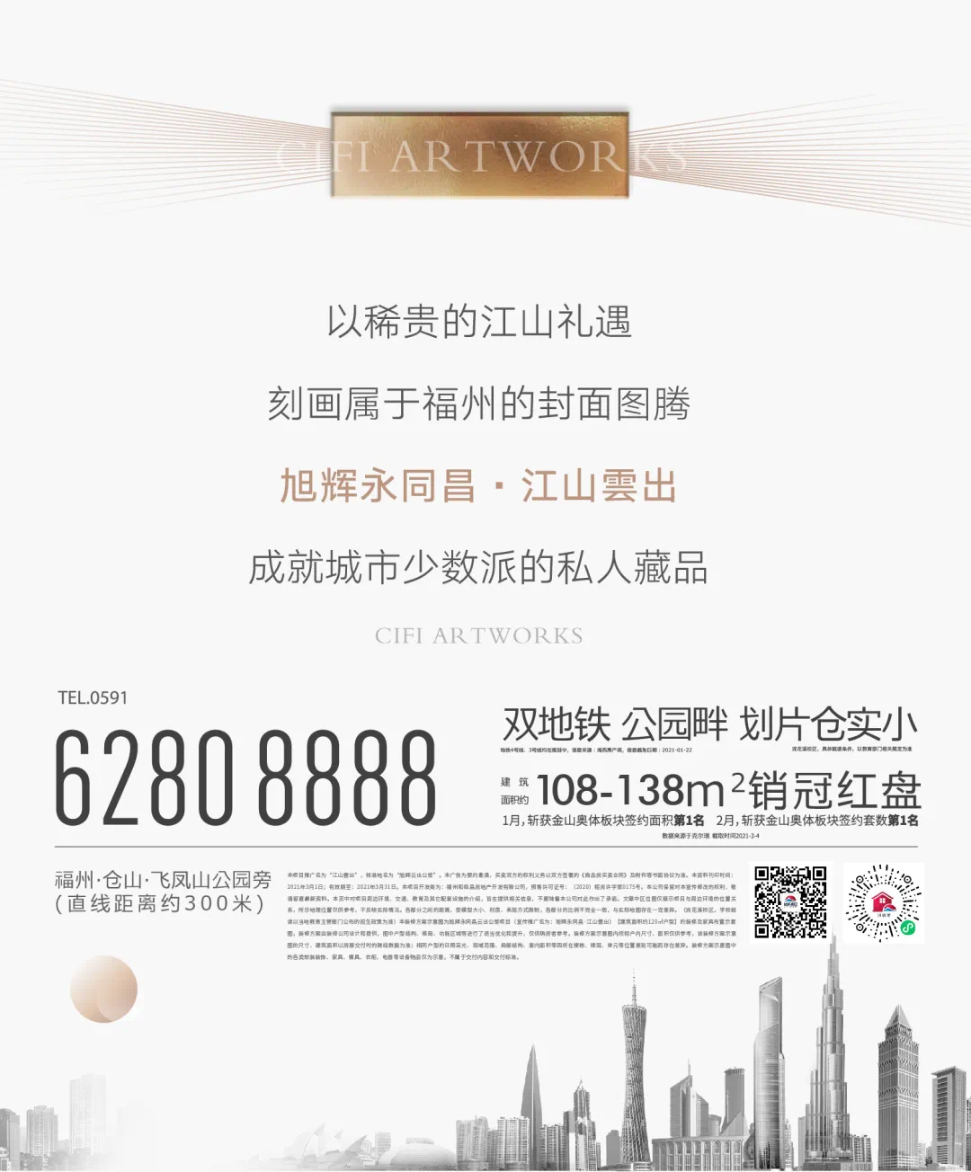 1.本项目推广名为“江山雲出”,核准地名为“旭辉云出公馆”。本广告为要约邀请,买卖双方的权利义务以双方签署的《商品房买卖合同》及附件等书面协议为准。本资料刊印时间:2021年3月25日;有效期至:2021年12月31日。本项目开发商为:福州和极昌房地产开发有限公司,预售许可证号:(2020)榕房许字第0175号。本公司保留对本宣传修改的权利,敬请留意较新资料。本户装修方案示意图为旭辉云出公馆项目(宣传推广名为:旭辉永同昌·江山雲出)【Y6幢103室】【建筑面积约108㎡户型】【Y6幢106室】【建筑面积约138㎡户型】的装修及家具布置示意图,装修方案由装修公司设计和提供,图中户型结构、格局、功能区域等进行了适当优化和提升,仅供购房者参考。装修方案示意图内所标户内尺寸、面积仅供参考,该装修方案示意图的尺寸、建筑面积以房屋交付时的测绘数据为准;相同户型的日照采光、视域范围、局部结构、套内面积等因所在楼栋、楼层、单元等位置差别可能而存在差异。装修方案示意图中的各类软装装饰、家具、寝具、衣柜、电器等设备物品仅为示意,不属于交付内容和交付标准。首期付23万分期付款说明:分期付款的客户签署认购书10天内付楼款5%以上并签署《商品房买卖合同》,后期按照合同规定支付剩余款项,后分期付款不同于商业贷款,对应房源为G2-102,详询各售楼部。2.本页中对项目周边环境、交通、教育及其它配套设施的介绍,旨在提供相关信息,不意味着本公司对此作出了承诺。文章中区位图仅展示项目与周边环境的位置关系,所示地理位置仅供参考,不反映实际情况。各部分之间的距离,受模型大小、材质、表现方式限制,各部分的比例不完全一致,与实际地图存在一定差异。区位图中项目周围自然环境、交通及其他公共设施、市政服务机构、教育及医疗等公共服务机构的介绍,旨在提供相关信息,且并不完整表达周边相关所有信息,实际情况以现状、政府规划及招生政策为准,购房前敬请前往实地观看,实际了解距离关系及周边建筑物现况,或者就项目周边规划咨询相关政府主管部门。区位图中所展示的项目周边状况,不作为出卖人的承诺。