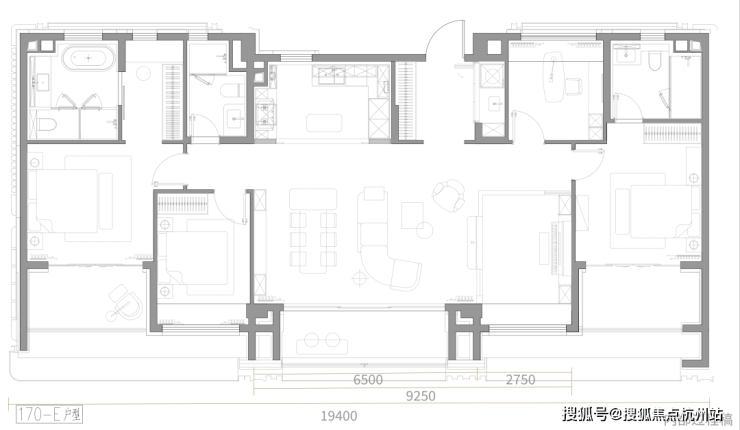 170㎡B户型平墅:五面宽设计,南向总面宽约17.2米,餐客厅面宽约8.2米。主卧面宽约5.4米,尊崇独立衣帽间,空间阔绰可分男女。三个套房。独立八百库收纳、卫浴收纳拉满。