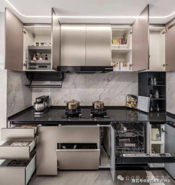 厨房的收纳空间几乎能填满整个厨房空间,这些收纳空间不是随意塞满的,而是根据日常烹饪习惯的频率来贴心规划。
