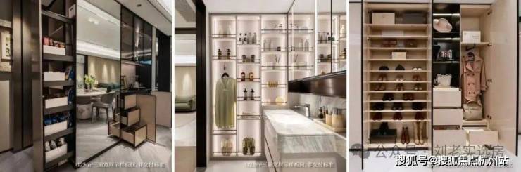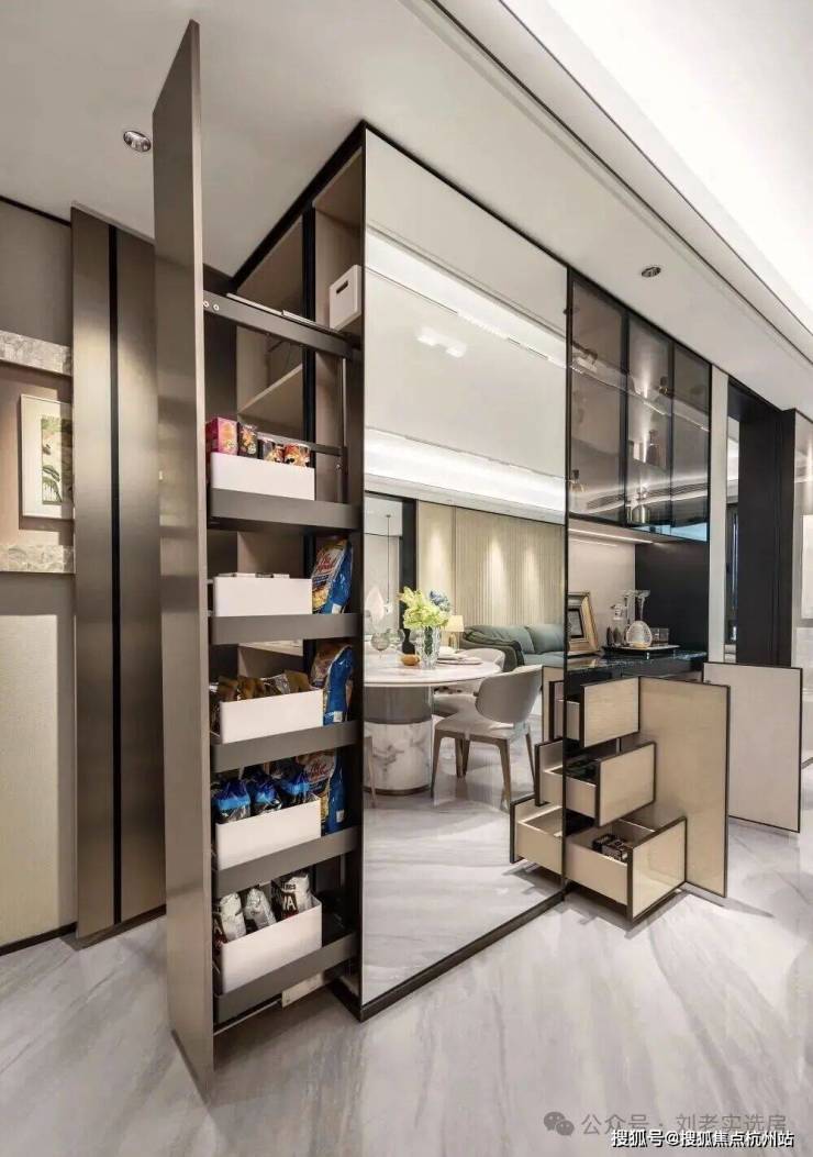 125㎡户型仅仅在客厅公区,就打造了三处 整面墙的柜子来做收纳,除了传统的收纳柜,还有隐藏推拉零食架、内嵌式吧台等创新收纳方案,从衣服鞋帽,到大件行李箱再到家用清洁工具,都有专属的安置空间。