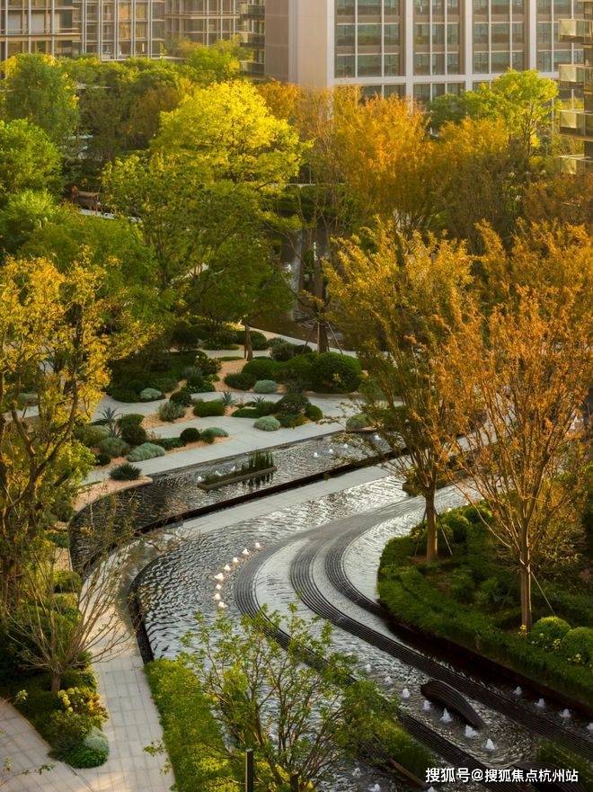 约6万㎡实景园林中,全冠移植的成年乔木与四季花卉形成精密的黄金配比——春季樱花与玉兰次第绽放,夏季香樟与银杏浓荫蔽日,秋季红枫与乌桕层林尽染,冬季松柏与腊梅点缀其间。