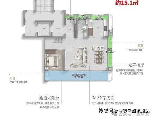 空间尺度:客厅连接约 9.8 米跑道式阳台,空间尺度感强;全卧室带飘窗,功能分区明确,满足二胎家庭或三代同堂需求。