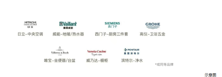 500万级的三房产品,配备了中央空调和地暖,厨具用了西门子,卫浴是唯宝、高仪,空调用的日立,地暖及热水器是威能(或同等品牌,以具体交付为准)。