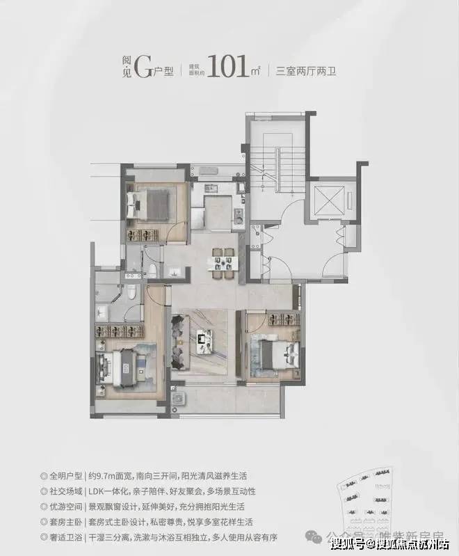 建面约101㎡精装3房,均价4.53万/㎡,总价400万级。采用霍尼韦尔新风、AO史密斯地暖 + 空调、西门子厨电(含洗碗机),全屋飘窗 + 无连廊设计,得房率超80%,每一寸空间都得到极致利用。