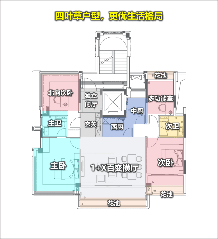 上叠露台可以做空中花园, 下叠庭院实现“推门见绿”, 中叠(约123㎡户型)配独立电梯厅、约13.4m南向面宽 、约6m横厅、南北双270°转角飘窗及花池赠送,体感接近整层大平层,实得率接近“满格”。