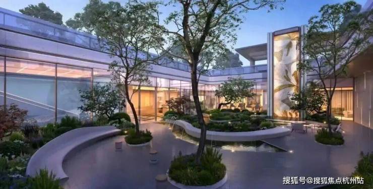 穿过会所,便步入层层叠水、绿意环绕的下沉庭院。