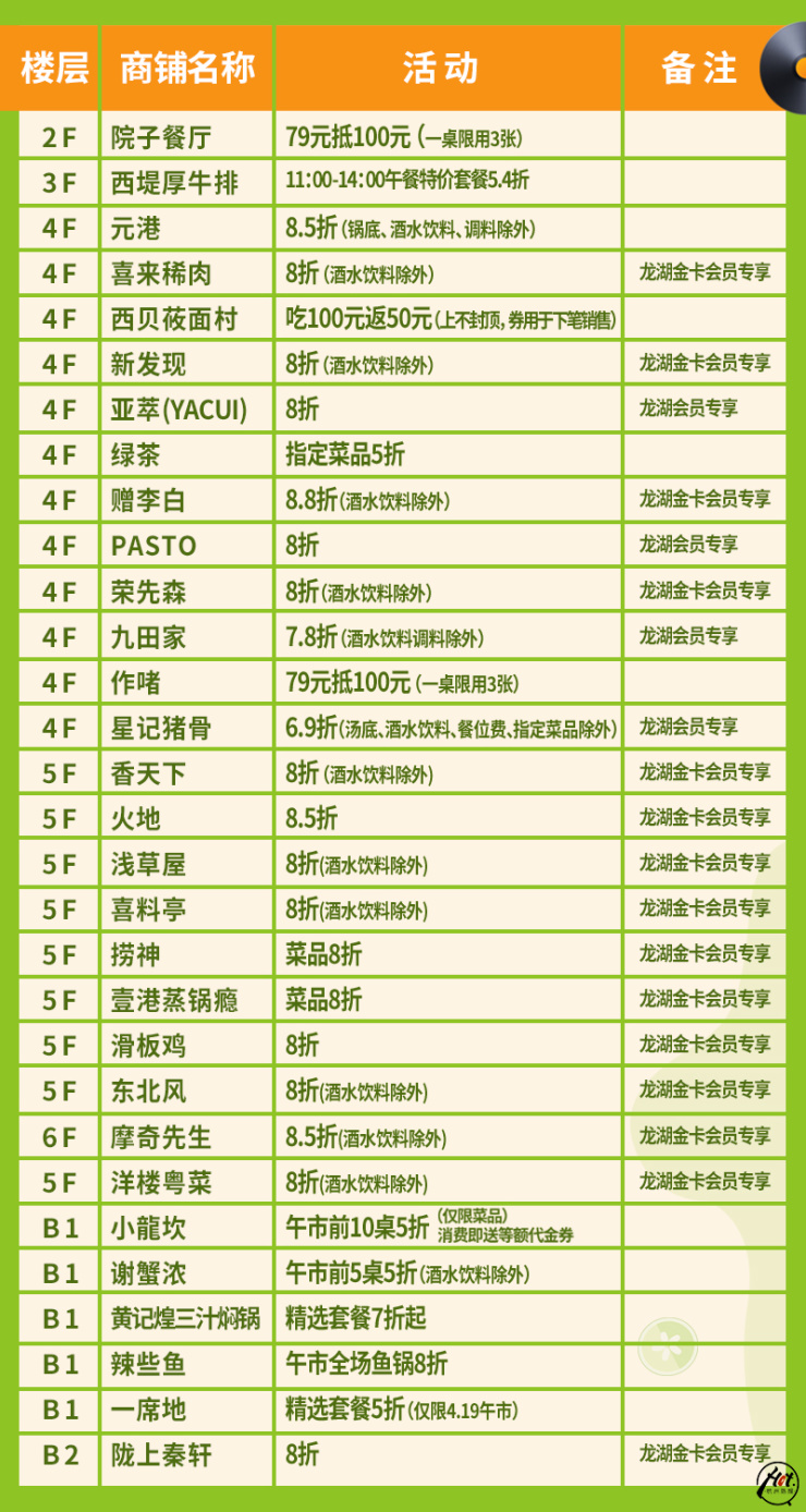 院子餐厅、蛙来哒、岳騰香、金胡椒、西堤厚牛排、元港、喜来稀肉、西贝莜面村、新发现、亚萃、绿茶、赠李白、荣先森、江边城外、避风塘、九田家、作啫、星记猪骨、小菜园、pasto怕事儿多、多伦多、香天下、火地、浅草屋、喜料亭、捞神、壹港蒸锅瘾、滑板鸡、东北风、摩奇先生、洋楼粤菜、舟东奶酸菜鱼、一席地、赞味坊、辣些鱼、黄记煌三汁焖锅、谢蟹浓、小龍坎、高丽烤肉、争鲜回转寿司
