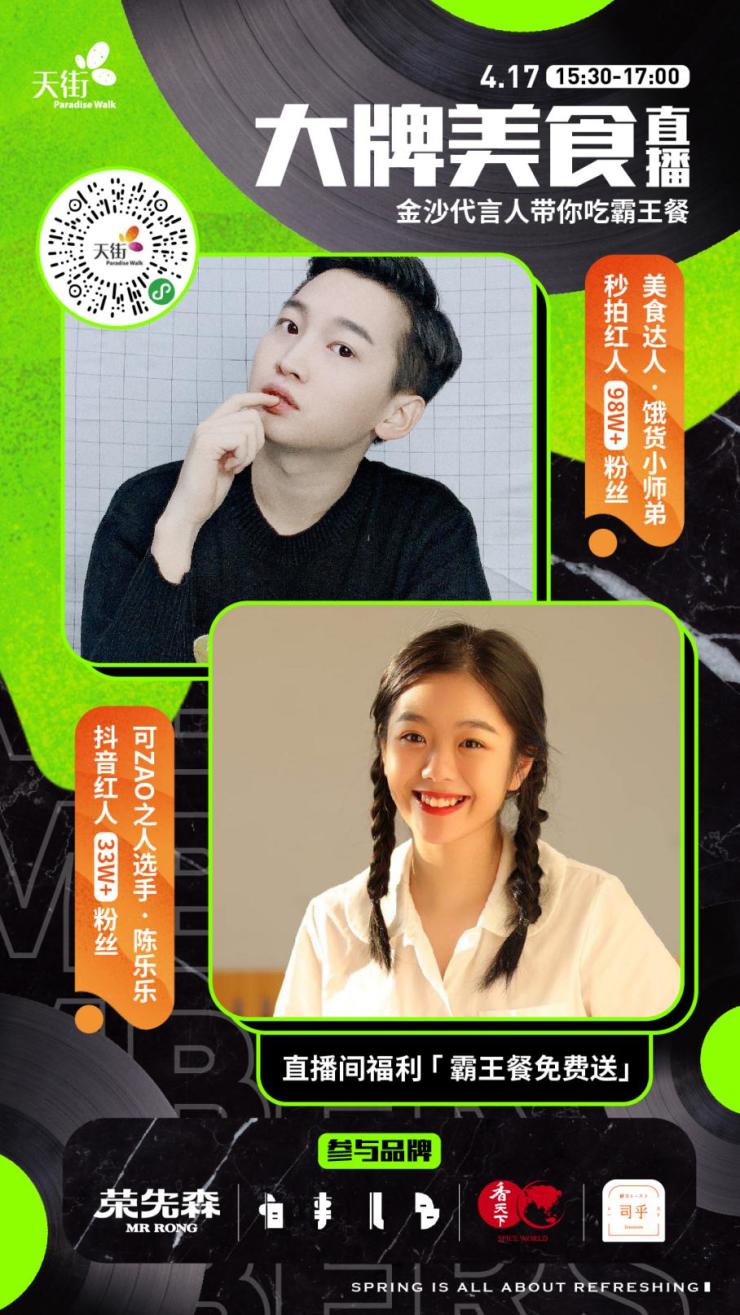 你的吃喝玩乐购所有需求 金沙天街统统帮你考虑到了 霸王餐、折上折全都有! 对于宠粉,就是这么霸道~ 最重要的事一定要较先说! 4月17日15:30-17:00金沙天街直播 美食达人——饿货小师弟 可ZAO之人TOP选手——陈乐乐 将会在直播中送出超多直播福利 一定要提前加关注更不会错过福利哦~