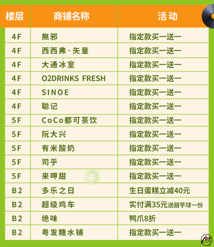 悦咖啡、無邪、西西弗·矢量、大通冰室、O2DRINKS FRESH、SINOE、聪记、CoCo、都可茶饮、阮大兴、有米酸奶、司乎 、来呷甜、糖纸、阿香米线、面包新语、莉莲蛋挞、西树泡芙、摩提工房、多乐之日、廖记棒棒鸡、南大门、粤發、不二烫捞、亲爱的锅包you、超级鸡车、丸兜兜、陇上秦轩、小杨生煎、越前、绝味、莓兽、福喜捞、周黑鸭、栗小方、巷脯、冰冰糖糖、南洋大师傅、秋莲妈妈