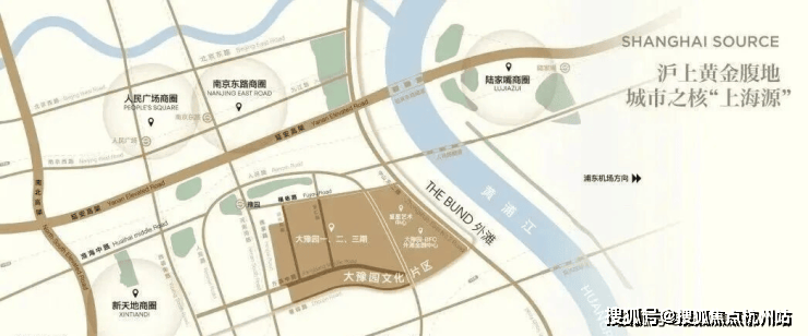 项目距外滩线仅 百米左右,东临 外滩、黄浦江,东临 豫园、 新天地,南侧是 南京西路商圈和 人民广场商圈,地理位置及商业资源得天独厚。