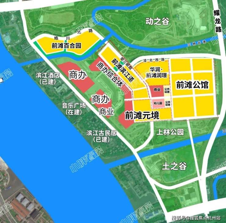 由北向南分别为 前滩中央商务区、前滩中央生活区、筠溪小镇(三林外环外地区)。