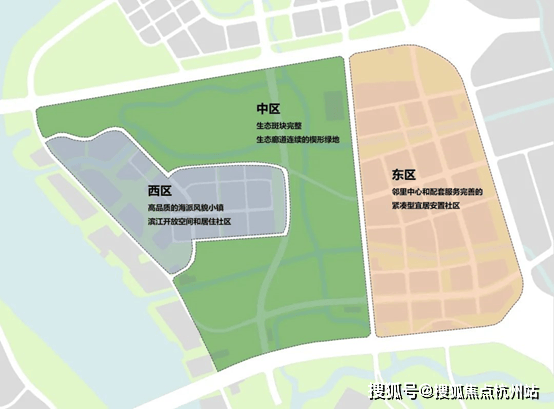 整个板块被分为三片区,分别是涵林路以东的东区,林浦路以西的西区,和其之间的中区,分别主打不同的功能: