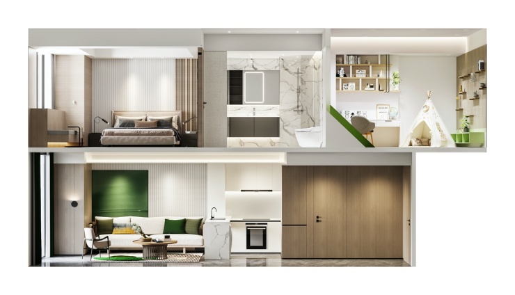 置身于现代奢适的样板房空间里,我们不难发现,在这通高达6.1米的云端跃墅中,空间将会呈现出这样一种迷人的布局:下层可以作为餐客连厅、起居空间、工作室,可以将不断攀升的事业、家人欢聚的时光,朋友之间的惬意交谈一并打包,上层为两个卧室加一个卫生间,无论是年轻夫妻,还是一家三口,空间都足够用。更为难得的是充足的采光面,足足270°的多面观景视野,俯览之间,都是城市高清大片。项目采用西门子厨电四件套(油烟机、电磁炉、微蒸烤一体机、洗碗机)、杜拉维特的智能一体化马桶台盆、史密斯热水器、五级过滤直饮净水器、科勒的水槽、龙头、日立的中央空调、马可波罗瓷砖等,用的全是一线大品牌。